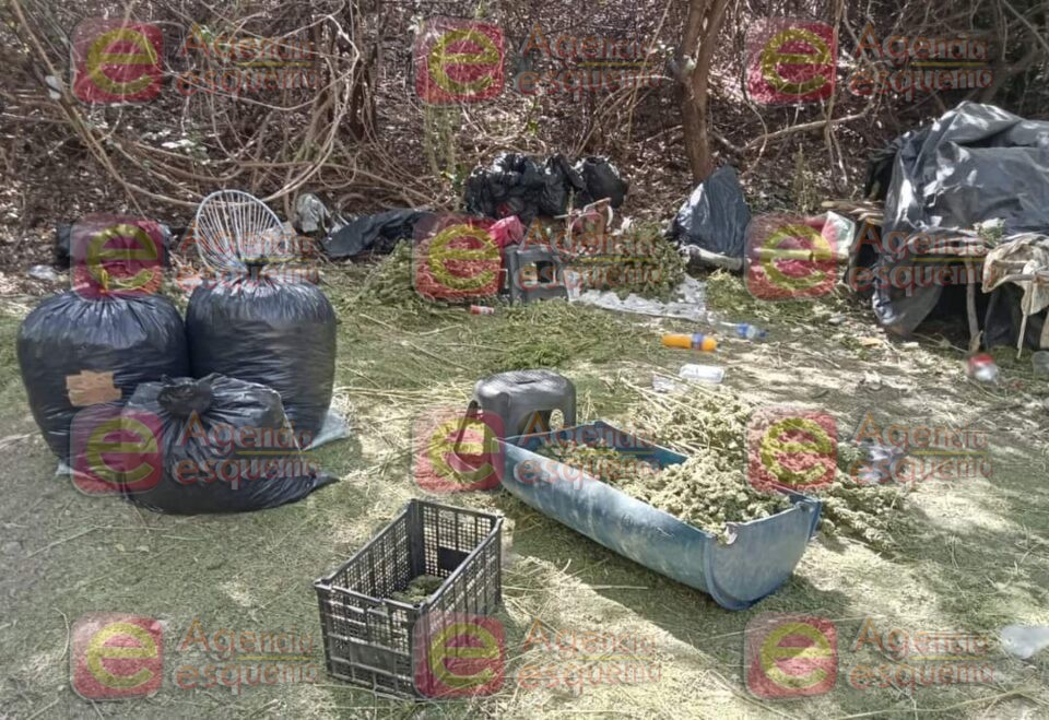 Con las correspondientes medidas de seguridad, los guardias nacionales y elementos del Ejército Mexicano inspeccionaron la zona y localizaron una motocicleta, además de lonas tendidas en el piso con marihuana, recipientes que contenían plantas del enervante y 13 bolsas negras, en cuyo interior había hierba verde y seca con las mismas características, lo que en total sumaba un estimado de 455 kilos.