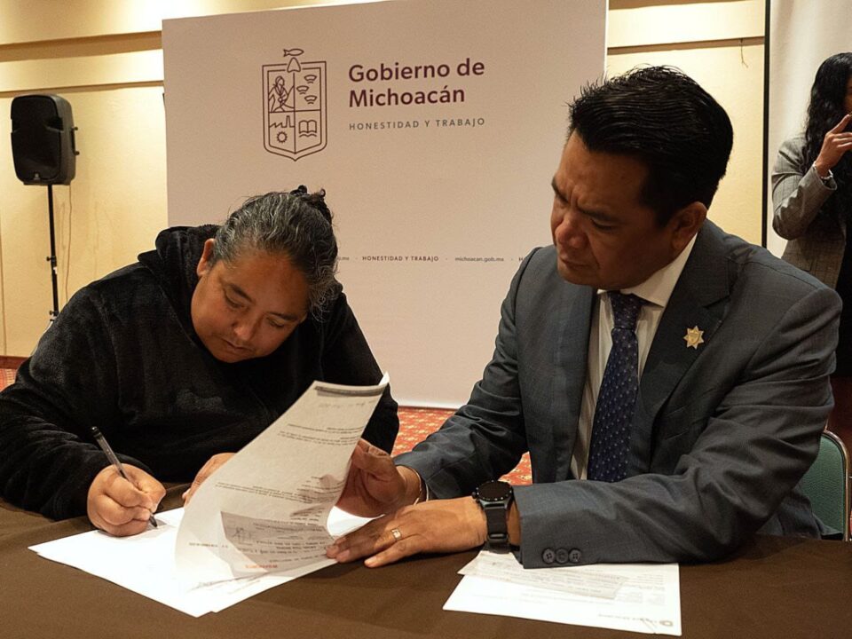 Morelia, Michoacán a 19 de enero del 2023.- En seguimiento a los compromisos de la administración estatal, encabezada por el Gobernador Alfredo Ramírez Bedolla, de dirigir los ahorros generados en la ejecución del Fondo para el Fortalecimiento para la Paz (Fortapaz), a seguros de vida para policías municipales, esta mañana se entregó el primer apoyo económico a la viuda de un elemento fallecido, perteneciente al municipio de Tacámbaro.