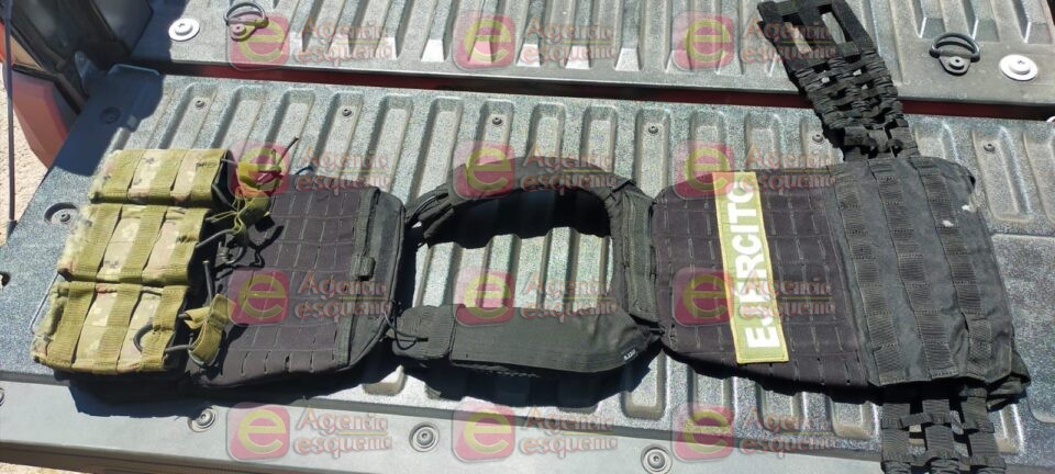 También las autoridades aseguraron un chaleco antibalas con la leyenda del Ejército, una tabla metálica con porta cargadores.