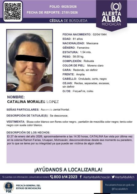 Se trata de Catalina Morales López, de 81 años de edad, quien fue vista por última vez el pasado 27 de enero en la colonia Ramón Farías.