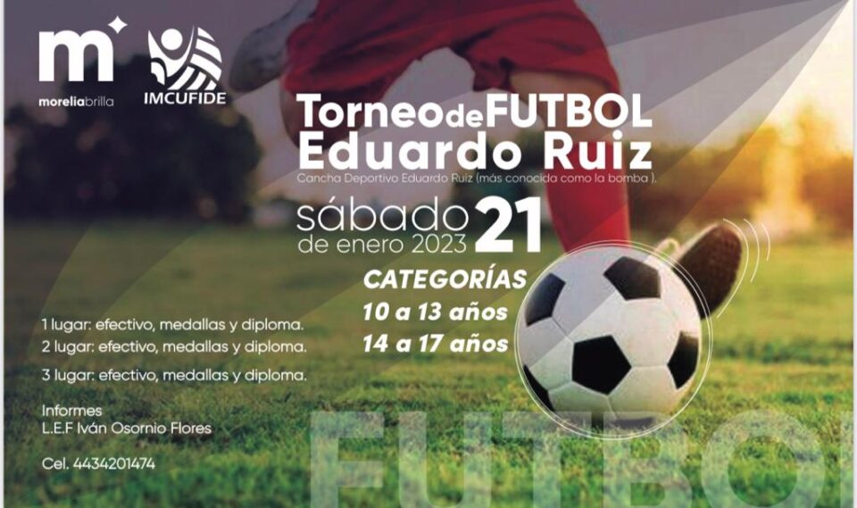 Morelia, Michoacán a 17 de enero de 2023.- El Instituto Municipal de Cultura Física y Deporte (Imcufide) invita a las y los infantes de 10 a 17 años de edad, a participar en el Torneo de fútbol “Eduardo Ruiz”, que iniciará el próximo sábado en la Unidad Deportiva del mismo nombre.