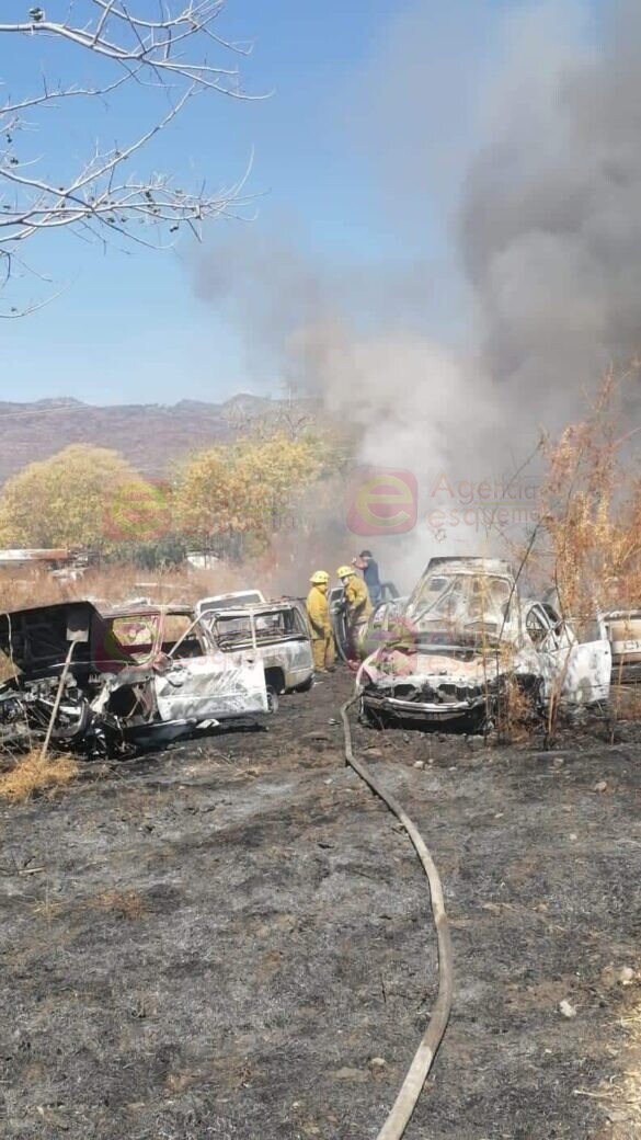 Apatzingán, Mich.-29 de enero del 2023.-Intensa labor de los elementos del Heróico Cuerpo de Bomberos para sofocar las llamas que calcinaron al menos cinco vehículos en el corralón local.