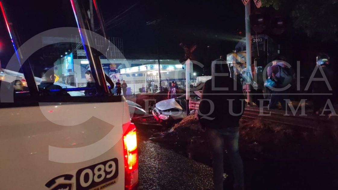 Morelia, Michoacán, 14 de mayo de 2025.- El conductor de un vehículo intentó ganarle el paso al tren, en el cruce del Periférico Paseo de la República a la altura de la colonia Vivero Indeco.