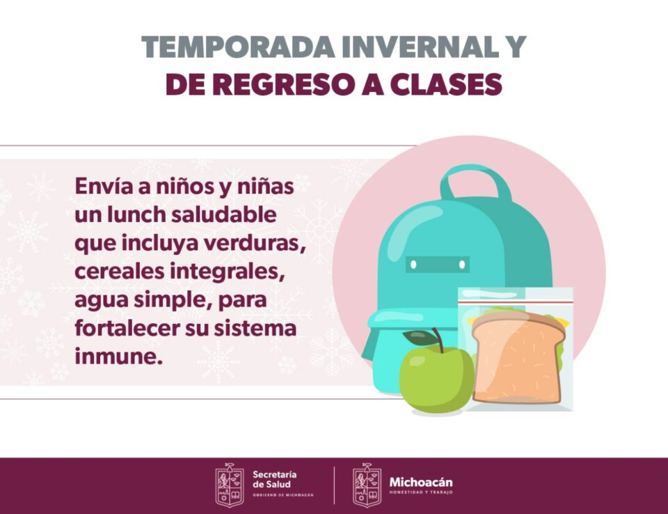 Además, es importante privilegiar que los lunch sean saludables, incluyéndoles verduras, cereales integrales y agua simple, para fortalecer las defensas.