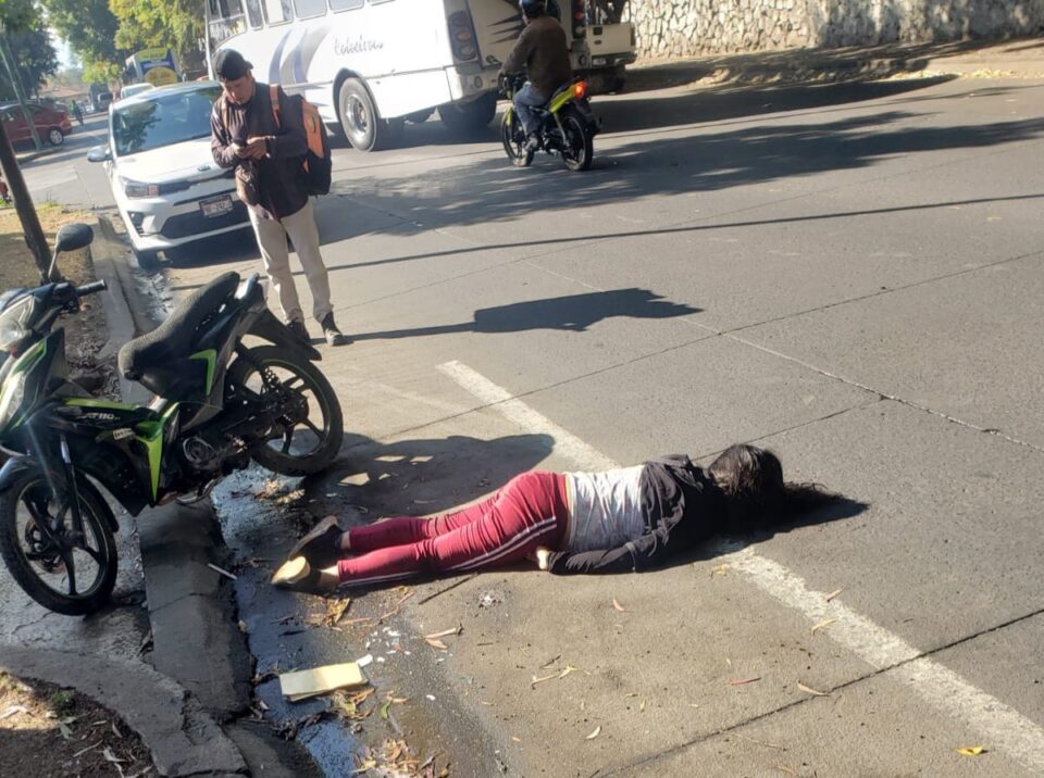 Uruapan, Michoacán, 13 de marzo de 2024.- Una jovencita sufrió lesiones de consideración al derrapar en su motocicleta sobre la avenida Fray Juan de San Miguel, frente al Parque Nacional y el Hospital Civil.