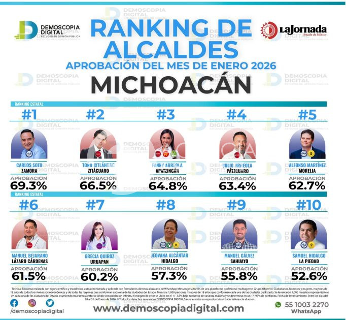 Morelia, Michoacán, 6 de febrero de 2026.- El presidente municipal de Pátzcuaro, Julio Arreola, se posicionó entre los alcaldes mejor evaluados de Michoacán, de acuerdo con el Ranking de Aprobación correspondiente al mes de enero de 2026, elaborado por la casa encuestadora Demoscopía Digital y difundido por La Jornada Estado de México.