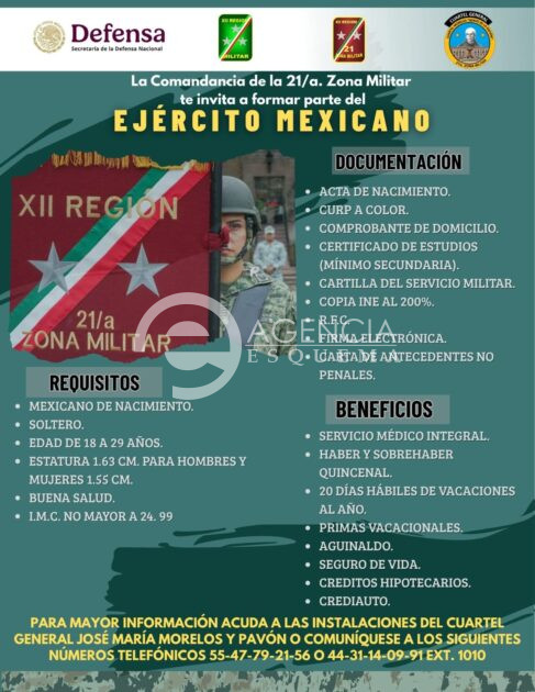 Morelia, Mich., a 21 de marzo de 2026.- La Comandancia de la 21/a. Zona Militar hace una invitación a todas las mujeres y hombres entre 18 y 29 años de edad, interesados en formar parte del Ejército Mexicano.