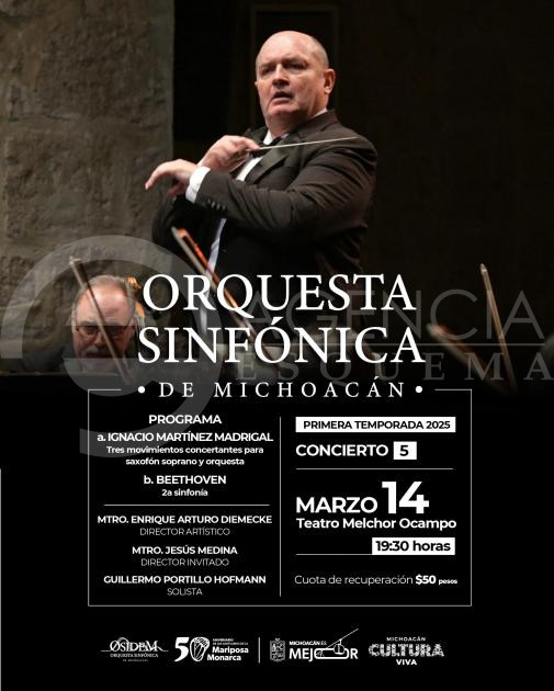 Morelia, Michoacán, 12 de marzo del 2025.- La Orquesta Sinfónica de Michoacán (Osidem) presentará su quinto concierto 2025 el 14 de marzo a las 19:30 horas en el Teatro Melchor Ocampo. Será una noche especial con la dirección del maestro Jesús Medina y la participación del solista Guillermo Portillo Hofmann, quien interpretará la obra “Tres movimientos concertantes para saxofón soprano y orquesta”, de Ignacio Martínez Madrigal, y cerrarán con la majestuosa Segunda Sinfonía de Beethoven.