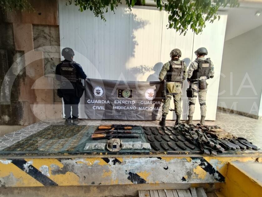 En la zona, los agentes policiales y castrenses localizaron cuatro fusiles calibre 7.62×39 mm, 20 cargadores y 870 municiones; además chalecos balísticos y aproximadamente 100 gramos de hierba verde seca con las características propias de la mariguana.