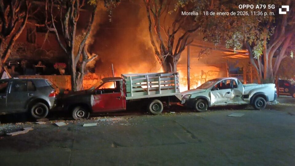 Morelia, Michoacán, 18 de enero del 2026.-Cerca de la media noche de este domingo, un taller de hojalatería y pintura ardió en llamas, cuyo fuego al parecer fue de manera intencional.