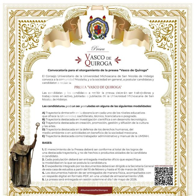 Morelia, Michoacán, a 18 de febrero de 2026.- La Universidad Michoacana de San Nicolás de Hidalgo (UMSNH) convoca a la comunidad nicolaita y a la sociedad en general a postular candidatas y candidatos para recibir la Presea «Vasco de Quiroga», distinción que reconoce trayectorias ejemplares alineadas con el humanismo que caracteriza a la casa de estudios.