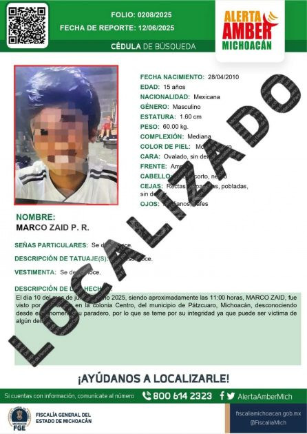 Pátzcuaro, Michoacán, 13 de junio de 2025.- La noche de este jueves fue localizado un adolescente de 15 años que había sido reportado como desaparecido el pasado 10 de junio.