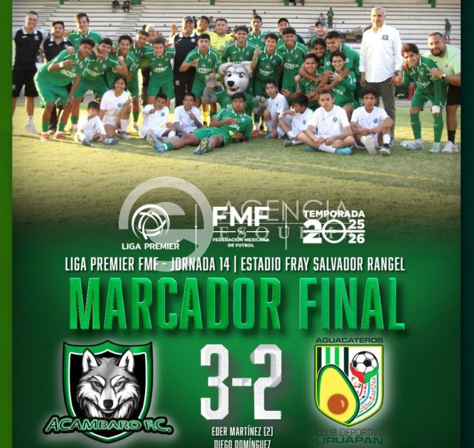 ACÁMBARO, Guanajuato, 9 de febrero de 2026.- El equipo de futbol Aguacateros Uruapan, sufrió una derrota de 2 goles contra 2, con el equipo Acámbaro FC, en juego correspondiente a la jornada 14 de la segunda vuelta de la fase de calificación, de la Liga Premier Serie B.
