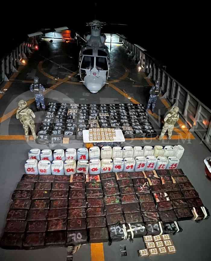 - Personal naval asegura 8 mil 361 kilogramos de carga ilícita, lo que representa la mayor cantidad de droga asegurada en una operación marítima, sin precedentes en la historia de la Institución.