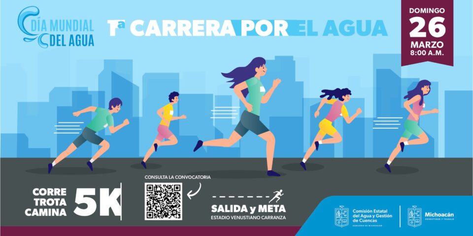 Morelia, Michoacán, 10 de marzo de 2023.- Para conmemorar el Día Mundial del Agua, que se celebra cada 22 de marzo, se llevará a cabo la primera Carrera por el Agua “Camina, Trota o Corre” 5 Km, el próximo 26 de marzo a partir de las 8:10 horas con salida y meta en el Estadio Venustiano Carranza del Centro Deportivo Ejército de la Revolución (CDER), donde participarán 300 corredores inscritos.