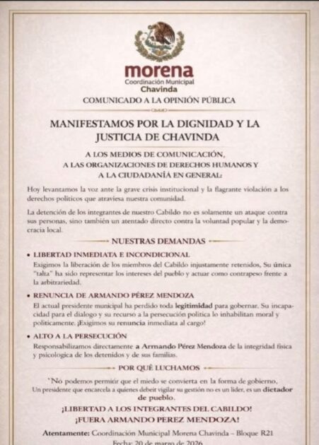 Chavinda, Michoacán, 28 de marzo del 2026.– Fuentes allegadas al municipio, revelaron que el Comité Municipal de Morena está siendo financiado por el ex presidente morenista Jaime Silva desde los Estados Unidos, quien gobernó la administración anterior.