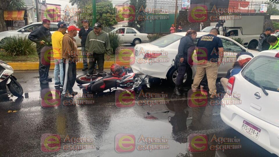 Uruapan, Michoacán, 20 de junio de 2024– Lesiones de consideración sufrió un motociclista al chocar por alcance contra un vehículo al parecer debido al exceso de velocidad sobre piso mojado, accidente registrado la tarde de este jueves sobre la calzada Benito Juárez, a la altura de la colonia La Charanda.