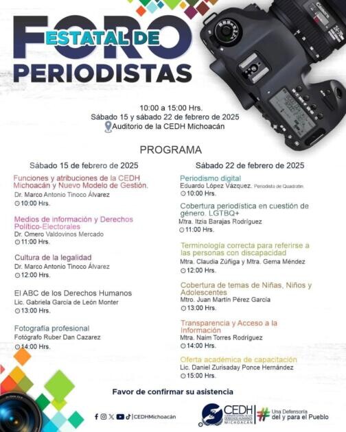 Morelia, Michoacán, 12 de febrero de 2025.- Dotar a los periodistas y comunicadores de herramientas útiles para el desempeño de su labor, con perspectiva de derechos humanos, es uno de los objetivos del Curso-Taller que la Comisión Estatal de los Derechos Humanos de Michoacán ofrecerá a comunicadores del Estado.