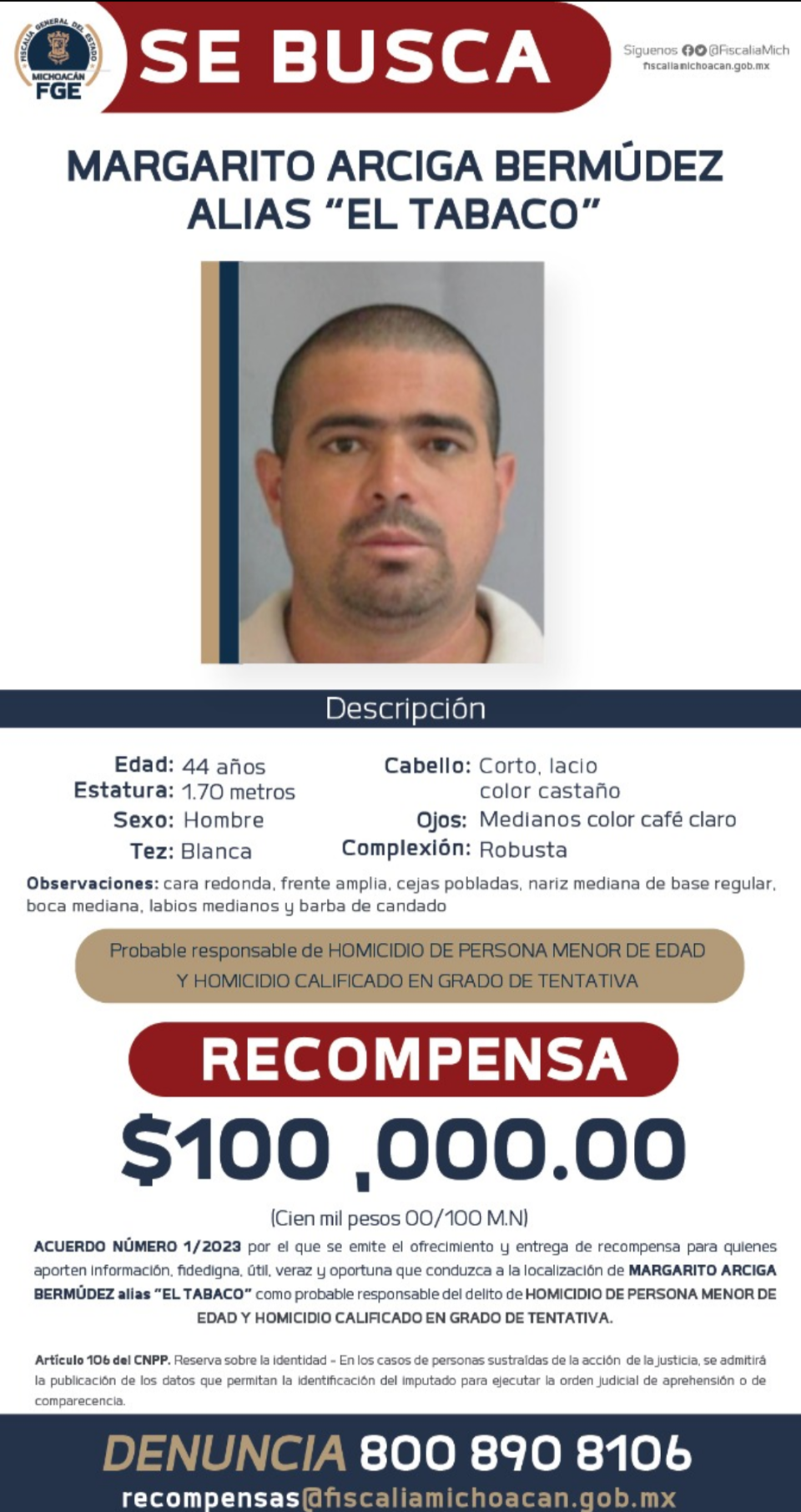 Morelia, Michoacán, a 6 de enero de 2023.- La Fiscalía General del Estado de Michoacán (FGE) expidió el acuerdo por los que se emite el Ofrecimiento y Entrega de Recompensa para quienes aporten información fidedigna, útil y oportuna que conduzca a la localización de Margarito Arciga Bermúdez, alias «El Tabaco», por su posible relación en el delito de homicidio de persona menor de edad y homicidio calificado en grado de tentativa; hechos perpetrados el pasado 25 de diciembre, en Ario de Rosales.