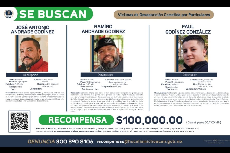 *Morelia, Michoacán, a 5 de mayo de 2023.-* La Fiscalía General del Estado de Michoacán (FGE), expidió el acuerdo por el que se emite el Ofrecimiento y Entrega de Recompensa para quienes aporten información fidedigna, útil y oportuna que conduzca a la localización de, José Antonio Andrade Godínez, Ramiro Andrade Godínez y Paul Godínez González, víctimas del delito de desaparición cometida por particulares.