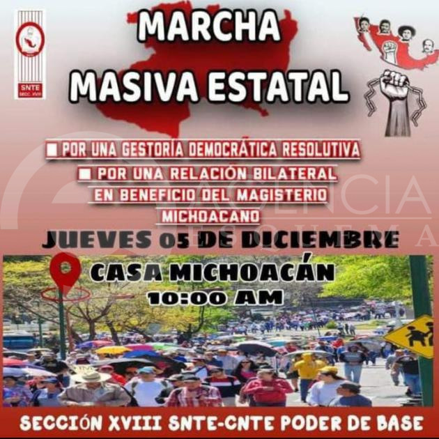 En esta capital michoacana, se prevé que la marcha, que denominaron “Masiva Estatal”, inicie a las 10 de la mañana del jueves en el Periférico Sur, por fuera de Casa Michoacán.