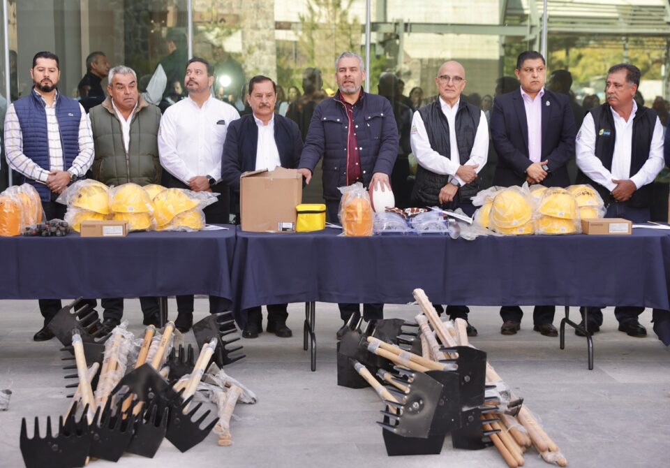 Uruapan, Michoacán a 17 de enero del 2023.- El gobernador Alfredo Ramírez Bedolla participó en la entrega de equipo que realizaron directivos de la Asociación de Productores y Empacadores Exportadores de Aguacate de México (APEAM), a 46 brigadas que combaten los incendios, tanto en huertas de aguacate como en zonas forestales de la región.