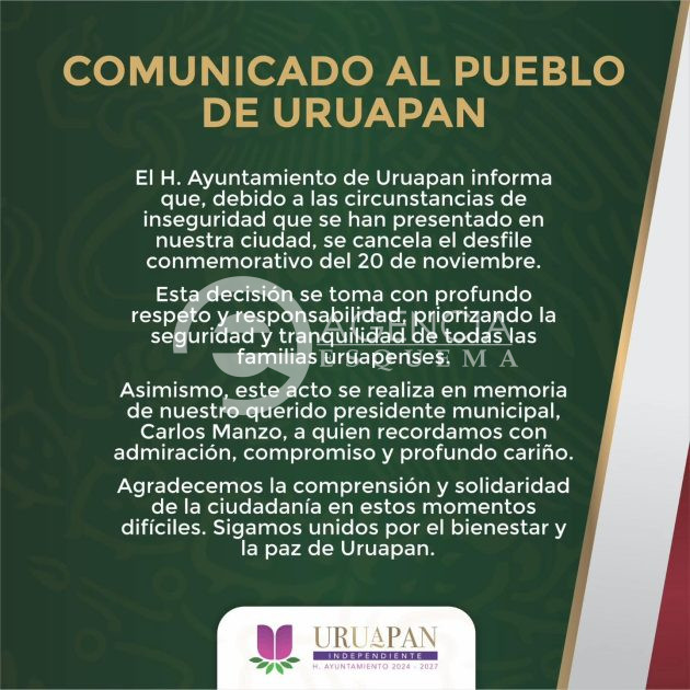«Esta decisión se toma con profundo respeto y responsabilidad priorizando la seguridad y tranquilidad de todas las familias uruapenses», se puede leer en un comunicado.