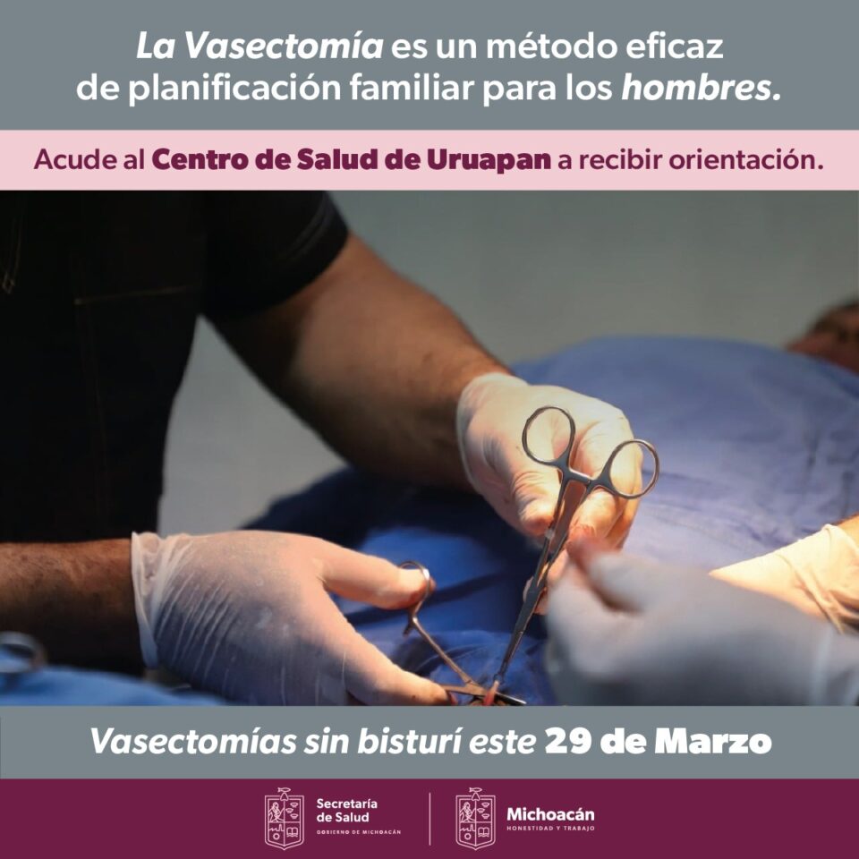 *Morelia, Michoacán, 15 de marzo de 2023.-*. Prepárate para el próximo miércoles 26 de marzo, la Secretaría de Salud de Michoacán (SSM) llevará a cabo una jornada gratuita de vasectomías sin bisturí en el centro de salud de Uruapan Dr. José Álvarez Amezquita.
