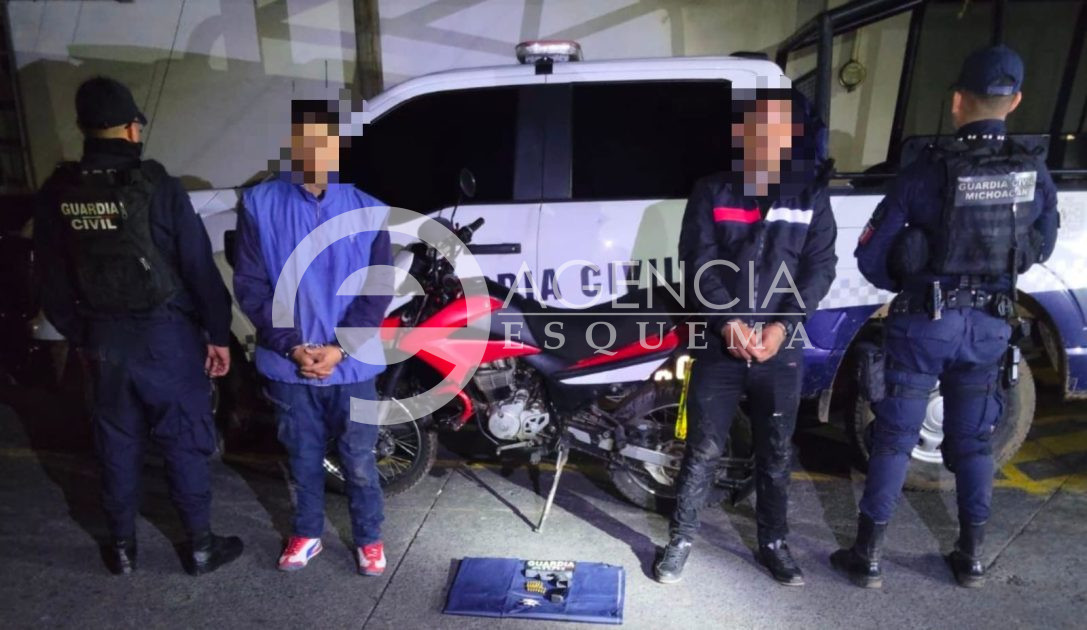 Uruapan, Michoacán, 13 de octubre del 2025.-Dos presuntos matones a sueldo fueron detenidos por elementos de la Guardia Civil del Estado, cuando circulaban a bordo de una motocicleta por las calles de la colonia Ejército Mexicano.