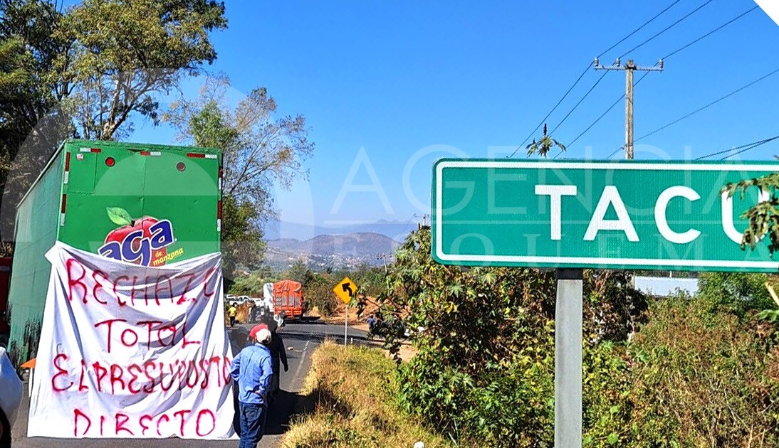 Tacuro (Eraxamani), Michoacán, 27 de febrero de 2025.- Habitantes de esta comunidad del municipio de Chilchota, bloquearon la carretera, como protestar por la intromisión del Gobierno del Estado y su operador político Pável Guzmán Macario, en las decisiones internas de la comunidad.