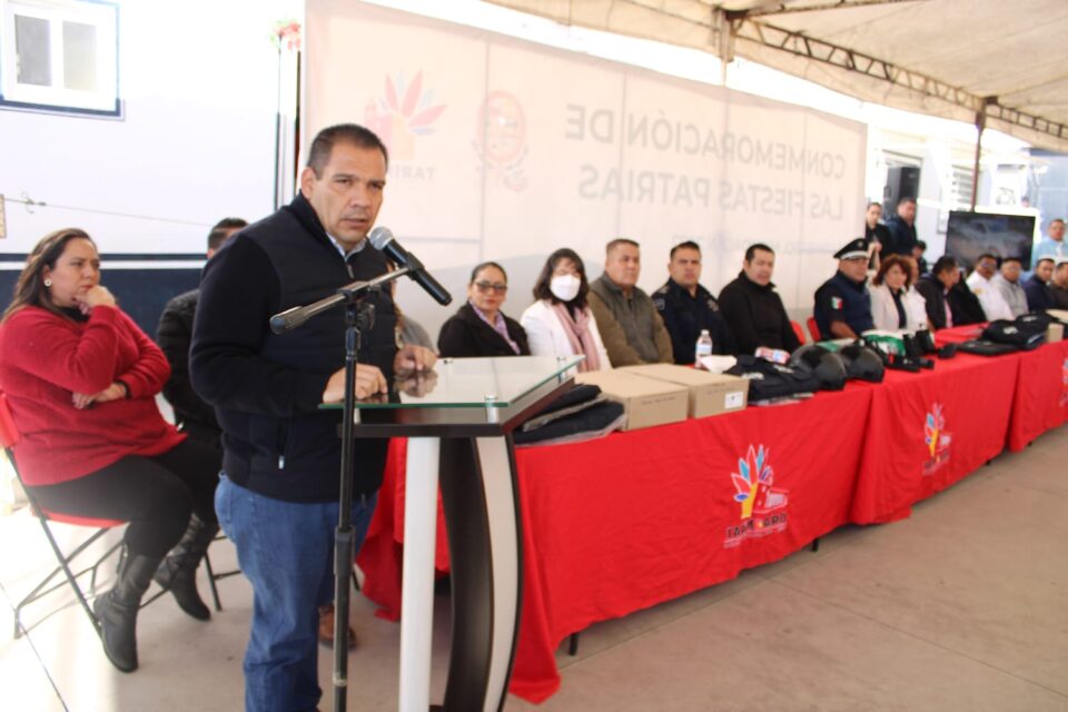 Tarímbaro, Michoacán a 4 de enero de 2023.- El presidente municipal, Bladimir González, encabezó la entrega de uniformes y equipamiento policial del programa “Fortalecimiento para la Paz” (Fortapaz), a los miembros de la Dirección de Seguridad Pública Municipal con el objetivo de brindar de más y mejores herramientas a las y los policías tarimbarenses.