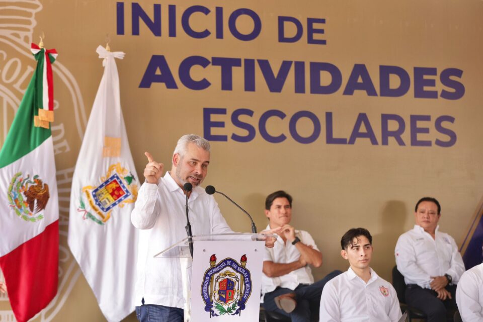 Lázaro Cárdenas, Michoacán, 7 de febrero del 2023.- Con un mensaje en el que destacó el humanismo de la Universidad Michoacana de San Nicolás de Hidalgo (UMSNH) y su aportación al desarrollo del estado, el gobernador Alfredo Ramírez Bedolla, asistió al arranque de semestre de la Máxima Casa de Estudios, con el que vuelven a las aulas 52 mil jóvenes.