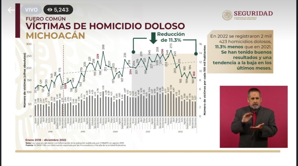 Morelia, Michoacán a 17 de enero de 2023.- Durante 2022 en Michoacán se registraron dos mil 423 homicidios dolosos, lo que representa una disminución del 11.3 por ciento en comparación con el 2021, en el que se registraron dos mil 734 homicidios dolosos, reconoció este martes en rueda de prensa matutina el Gobierno de México que encabeza Andrés Manuel López Obrador.