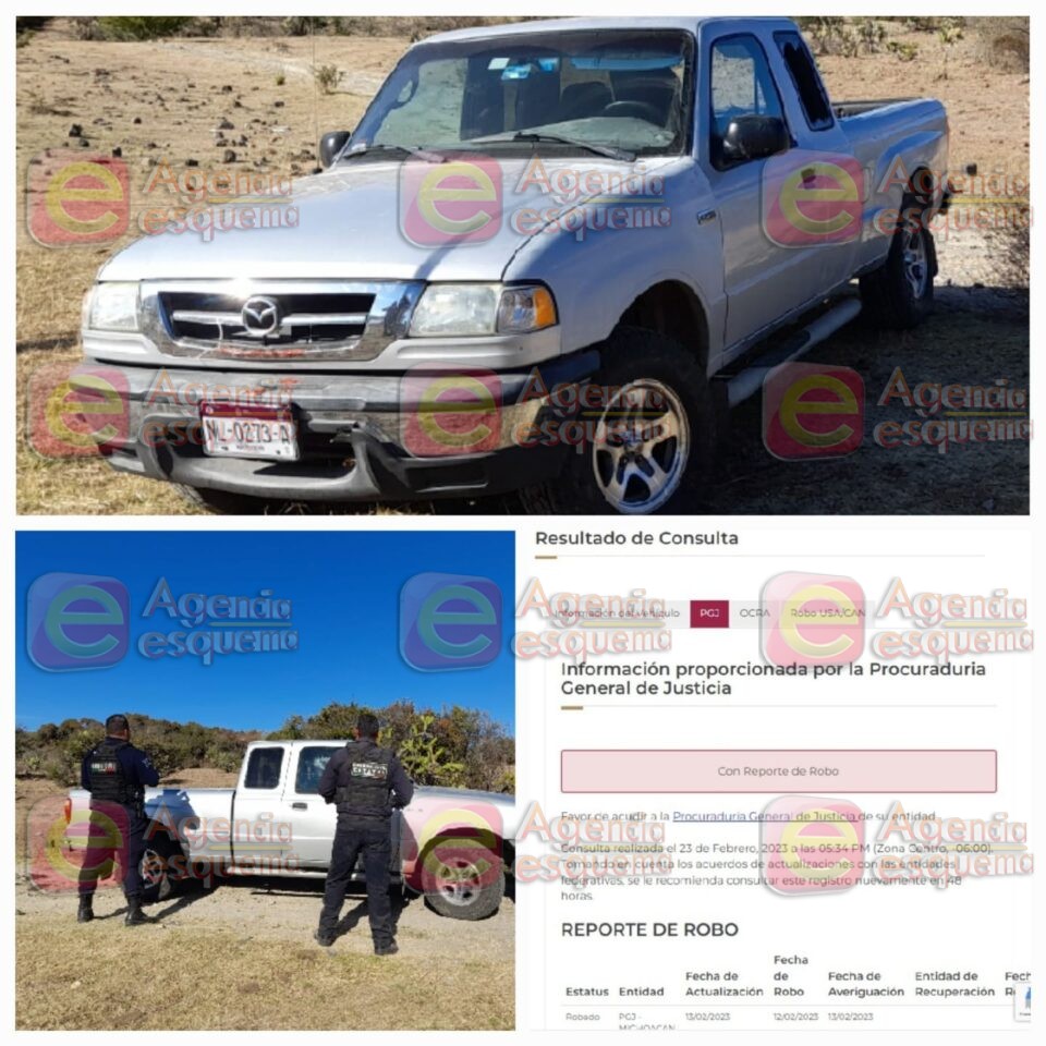 Tarímbaro, Mich.-24 de febrero del 2023.-El propietario de una camioneta fue despojado de su unidad tras ser amagado con un arma de fuego, sin embargo, la Policía Municipal de esta localidad logró recuperarla cuando acudió a un reporte en el que denunciaban a sujetos armados y los maleantes huyeron.