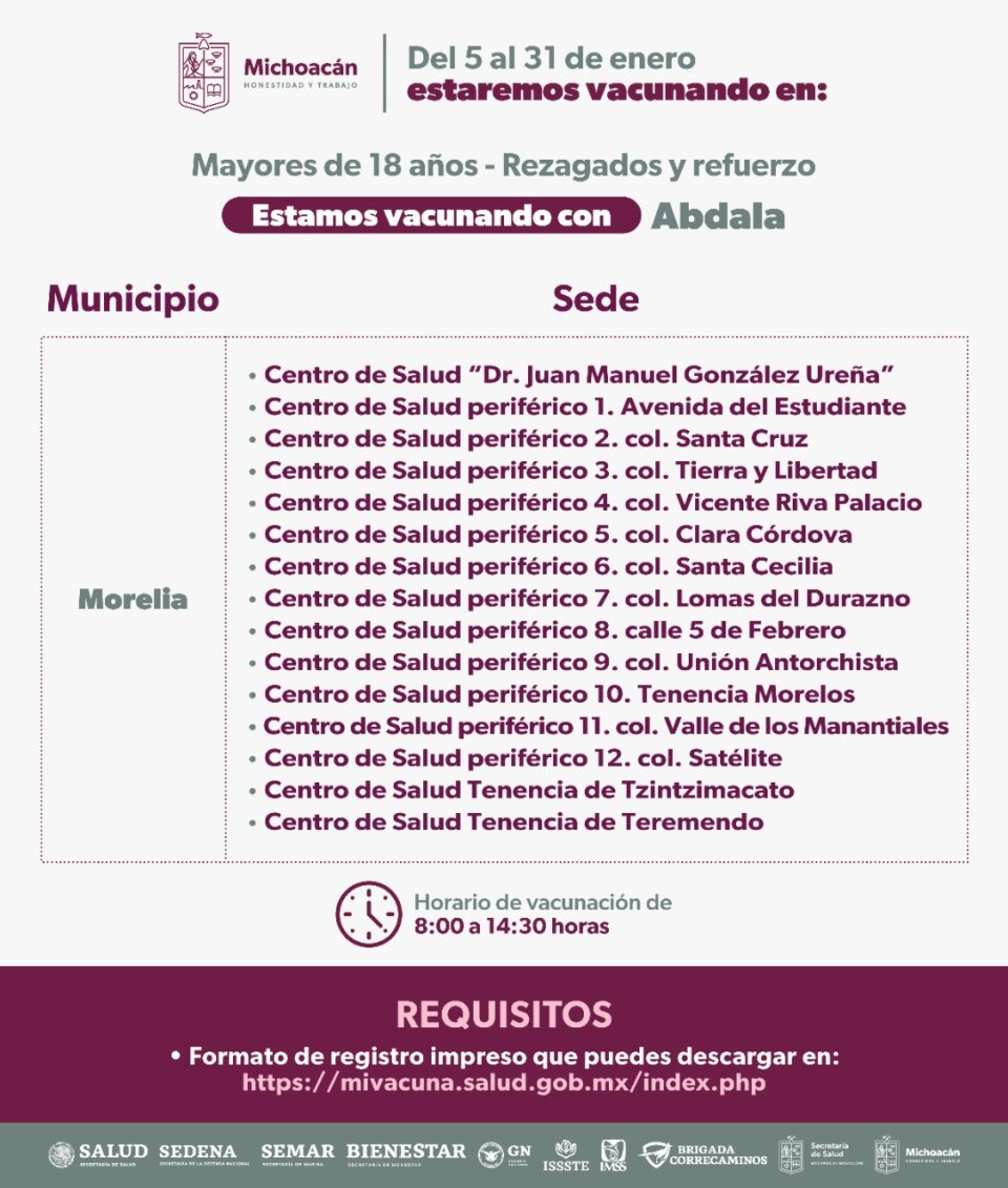 Los centros de salud de la ciudad de Morelia, donde se vacunará a los rezagados son el centro de salud “Dr. Juan Manuel González Urueña”, ubicado frente a la Plaza del Carmen; el centro de salud de la Avenida del Estudiante; en la colonia Santa Cruz, Tierra y Libertad, Vicente Riva Palacio y Clara Córdova.