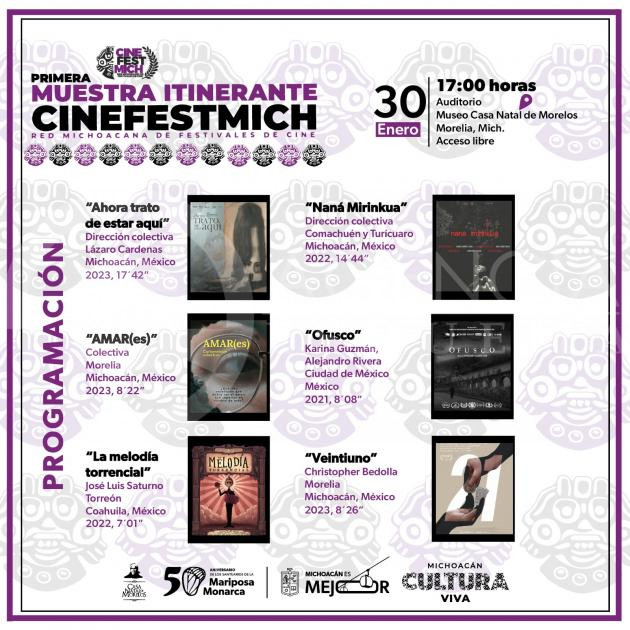 Ofusco, con dirección de Karina Guzmán, Alejandro Rivera; y “Veintiuno”, de director Christopher Bedolla, también formarán parta de esta jornada cinematográfica organizada por la Red Michoacana de Festivales de Cine, que tiene el objetivo de fomentar la cooperación, el intercambio de conocimientos y la promoción conjunta para potenciar la riqueza cultural de la región a través del cine.