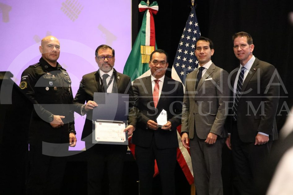 José Vega, oficial adjunto del Programa INL (Oficina de Asuntos Internacionales de Narcóticos y Aplicación de la Ley), y Shawn Morrow, subdirector adjunto de Agencia de Alcohol, Tabaco, Armas de Fuego y Explosivos (ATF), entregaron el reconocimiento al titular de la SSP Juan Carlos Oseguera Cortés, y al Fiscal General del Estado, Adrián López Solís, por la dedicación de ambas instituciones para consolidar un entorno de mayor tranquilidad en el estado.