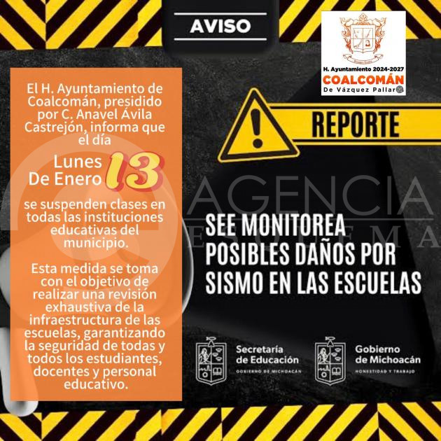Coalcomán, Michoacán, 13 de enero del 2024.- Debido al sismo de 6.1 grados que se registró ayer en Michoacán con epicentro en esta zona costera, se suspendieron las clases este día en el municipio para que autoridades de Protección Civil y la comuna lleven a cabo una revisión en las escuelas.