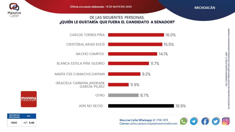 *Morelia, Michoacán, a 16 de mayo de 2023.,- El actual secretario de gobierno de Michoacán, Carlos Torres Piña se ubicó como el precandidato al Senado de la República que más ha crecido en las preferencias electorales de Morena, de acuerdo a la última encuesta de opinión de Massive Caller.