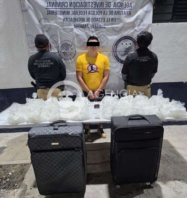 Ecuandureo, Michoacán, 06 de octubre del 2025.-Pretendía transportar 40 kilogramos de droga sintética, pero fue descubierto por personal operativo de la Fiscalía General de la República.