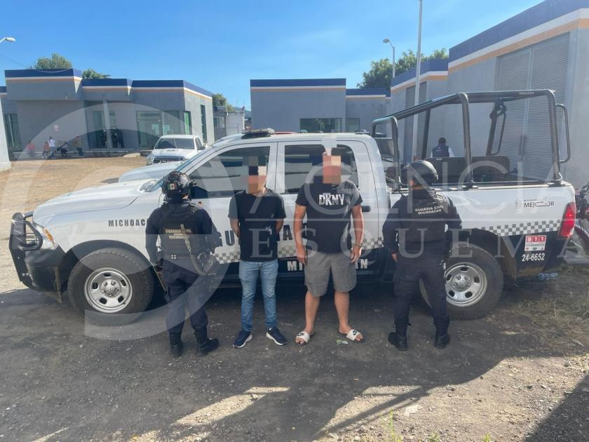Uruapan, Michoacán, 23 de enero de 2025.- Dos hombre que viajaban en una camioneta con reporte de robo fueron detenidos por elementos de la Guardia Civil en el estacionamiento de la Plaza 500, sobre el Libramiento Oriente, en La Cofradía.