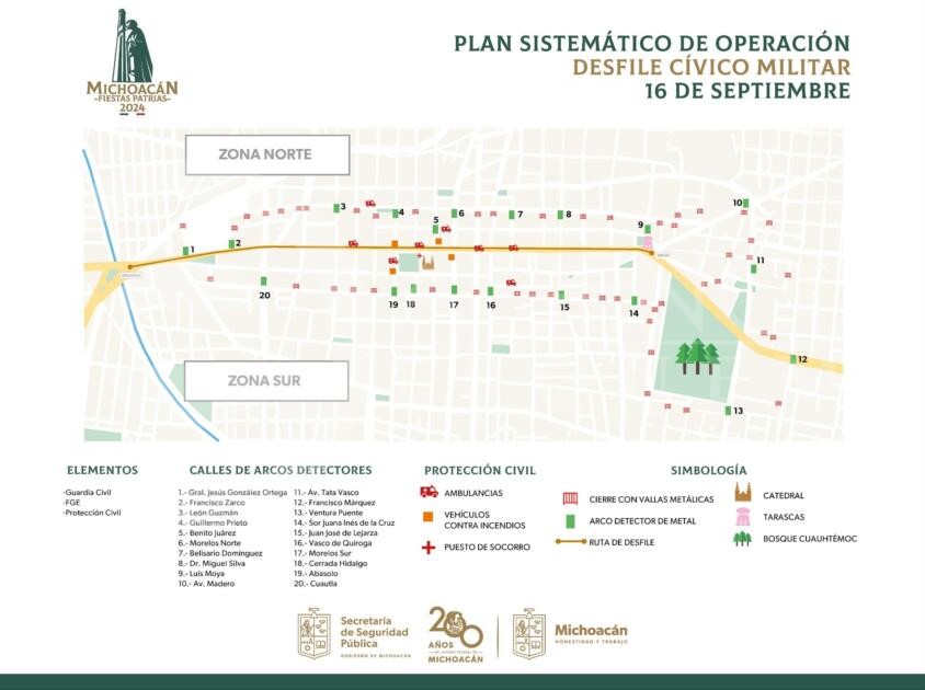 Morelia, Michoacán, 15 de septiembre del 2024.– La Secretaría de Seguridad Pública (SSP) informa a las y los asistentes a las Fiestas Patrias 2024, los 20 accesos donde se cuenta con arcos detectores de metal y de rayos X, por los cuales podrán ingresar al Centro Histórico de Morelia para disfrutar del desfile Cívico-Militar por el CCXIV aniversario de la Independencia de México.