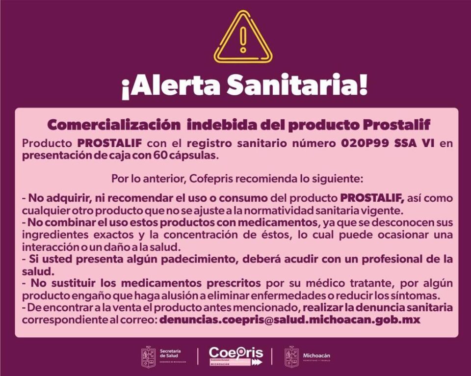 Es por ello que se informa a la población que el producto Prostalif no cuenta con registro sanitario para su fabricación y venta, además de que se desconoce si cuenta con estudios que avalen su calidad, seguridad y eficacia, por lo que no debe ser consumido por las personas, ya que representa un riesgo a la salud.