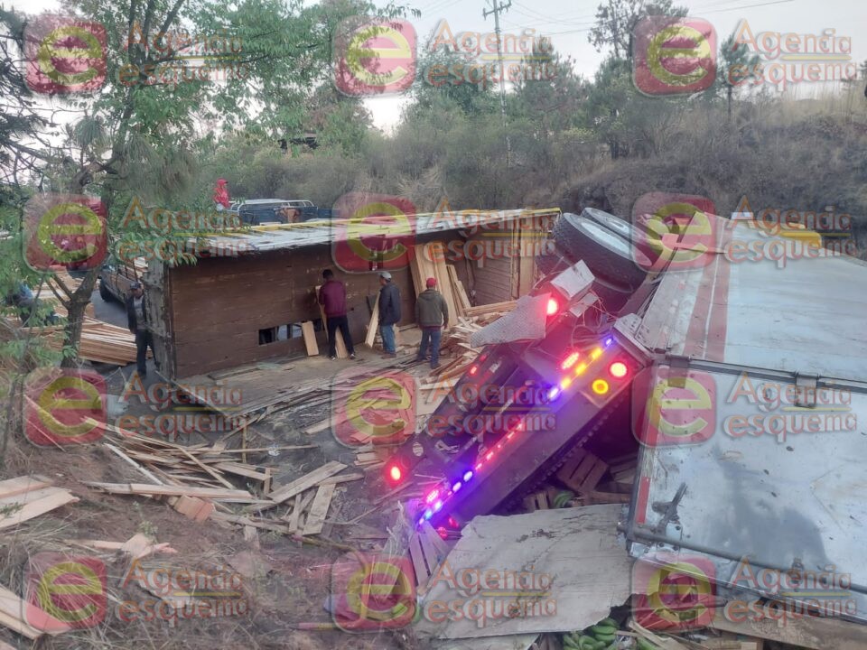 Uruapan, Michoacán, 3 de mayo de 2023.- Un camión cargado con varias toneladas de fruta, volcó esta mañana sobre la carretera Uruapan – Paracho, lo que ocasionó el cierre de la vialidad.