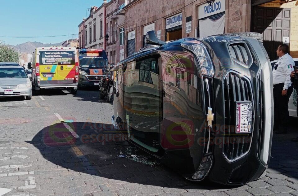 MORELIA MICH., 25 de enero.- Un vehículo chocó y se volcó en calles del centro de esta ciudad de Morelia, el conductor resultó con algunas lesiones, según reporte de los servicios de emergencia.