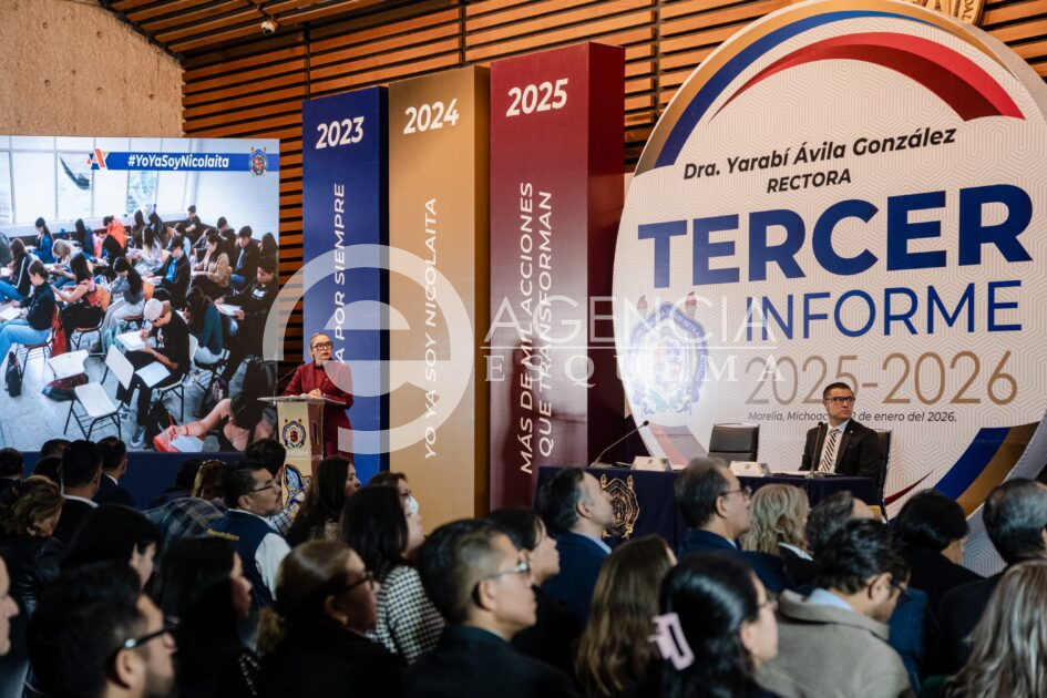 Morelia, Michoacán, a 13 de enero de 2026.- La rectora de la Universidad Michoacana de San Nicolás de Hidalgo (UMSNH), Yarabí Ávila González, destacó que hoy, la institución cuenta con una legislación del siglo XXI, preparada para los desafíos de futuro.